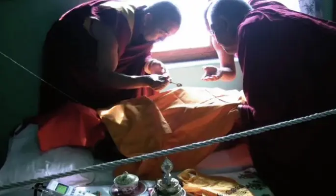 Рис 1. Джампа Ринпоче и Чоесанг собирают рингселы с тела Лобсанга Ринпоче