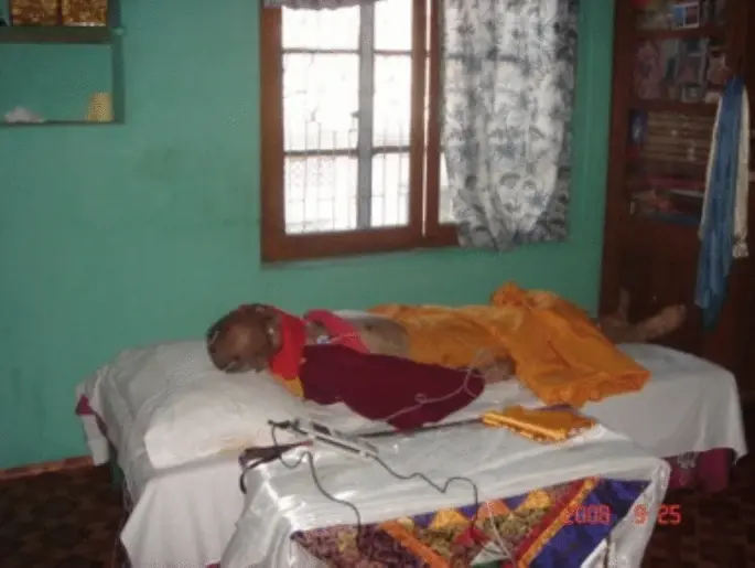 Тело Лобсанга Ринпоче не демонстрировало признаков разложения, гниения или изменения цвета и оставалось тёплым. Помимо беспокойства о корректной установке оборудования — поскольку это был наш первый участник исследования, — я был глубоко поражён тем, что наблюдал: продвинутый практик, сохранявший полную медитативную позу, чьё лицо и положение выглядели совершенно живыми, находился среди возбуждённой группы монахов, полностью поглощённых своими обязанностями, несмотря на то что он был клинически мёртв уже более недели.